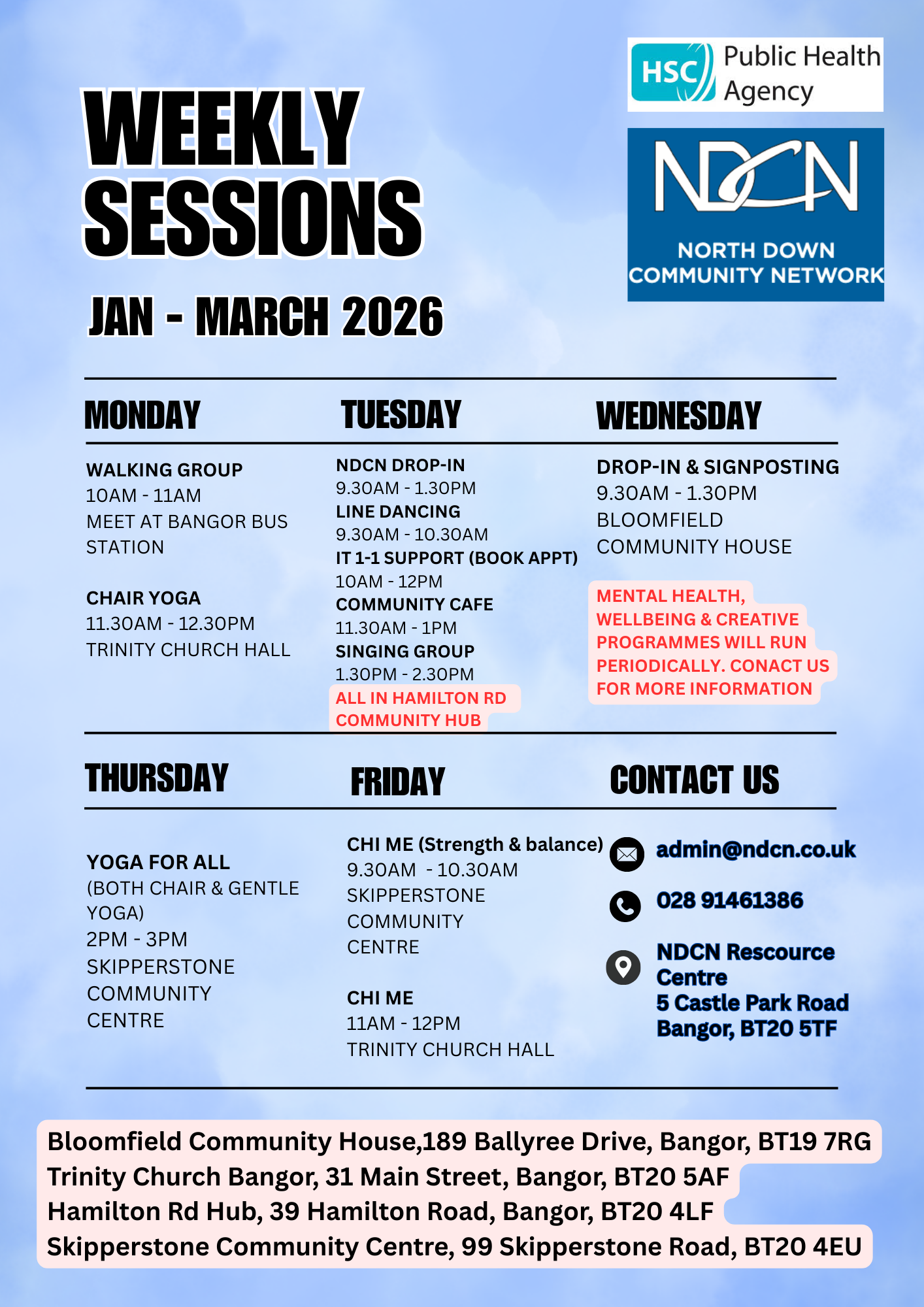 We have a range of mental and physical health and wellbeing activities available for people to attend and enjoy! Improving health and wellbeing, managing existing conditions or trying to prevent certain conditions can feel like a challenge, but you don’t have to do it alone. You are promised a warm welcome, useful information and the opportunity to get support and advice. Please come along and try something new! Some of these events and programmes are delivered in the Hamilton Road Community Hub in Bangor, while others are delivered out in communities to make them easy to get to and participate in.