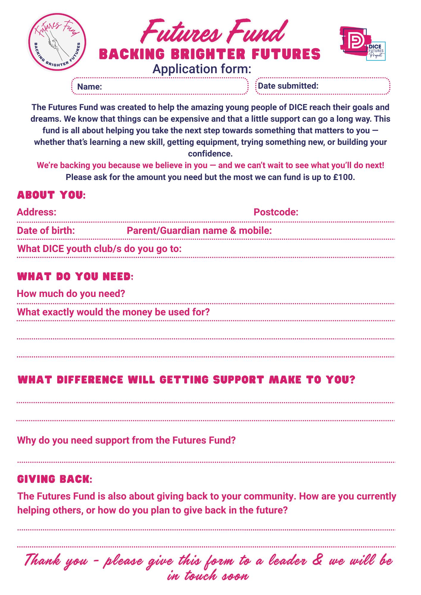 The Futures Fund is about backing the amazing young people in DICE — helping with the costs that sometimes stand between them and their goals.